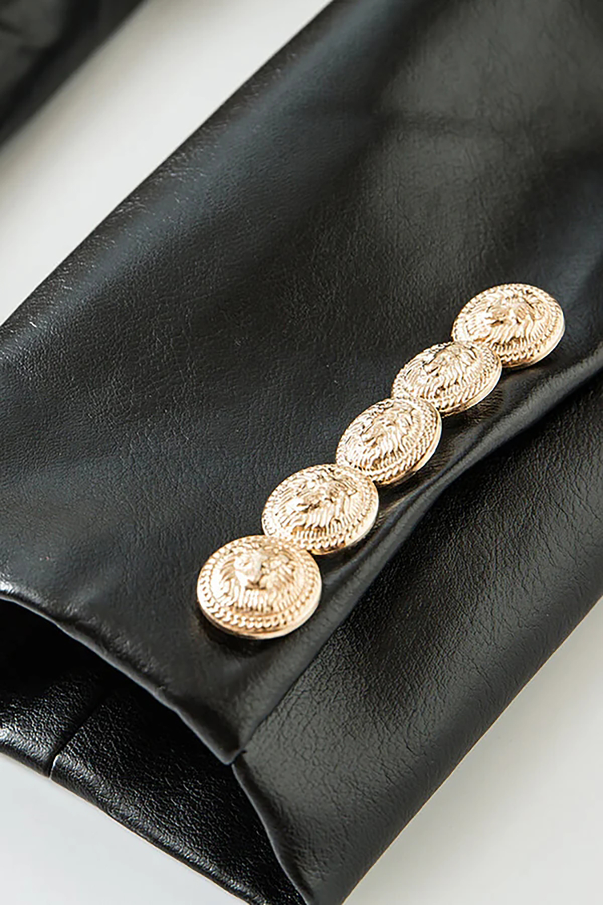 Elevate your wardrobe with our quiet luxury leather blazers. This vegan leather jacket exudes sophistication with its sleek design, peak lapels, structured padded shoulders, long sleeves, flap pockets, and double-breasted closure with chic embossed buttons, adding a touch of elegance. The slim fit ensures a waist-cinching silhouette, making it perfect for women who crave style and versatility. Available in classic black and metallic silver shades, this office-to-the-bar jacket is a must-have blazer outfit staple all year round.