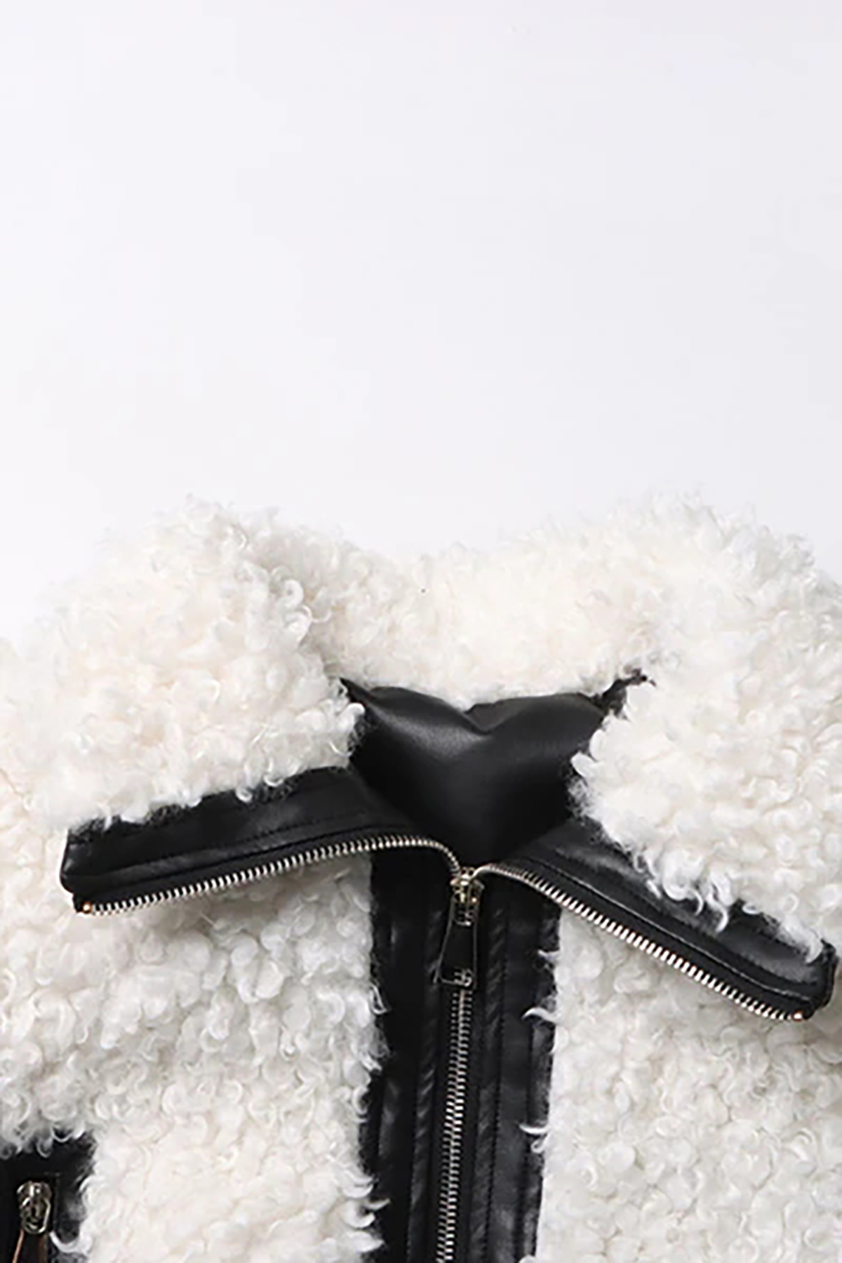 Looking for refreshed fur jackets to reinvigorate your wardrobe? From our boutique store, you can consider this faux shearling bomber jacket with high-quality vegan leather paneling. Detailed with double buckle straps on the neckline, the hybrid leather jacket features a high neckline, long sleeves with cuff zippers, zipper pockets, a zip-up fastening, and an elastic ribbed waistband for a waist-cinching effect. Create a street-style women's outfit by pairing with skinny leather pants and chunky boots.